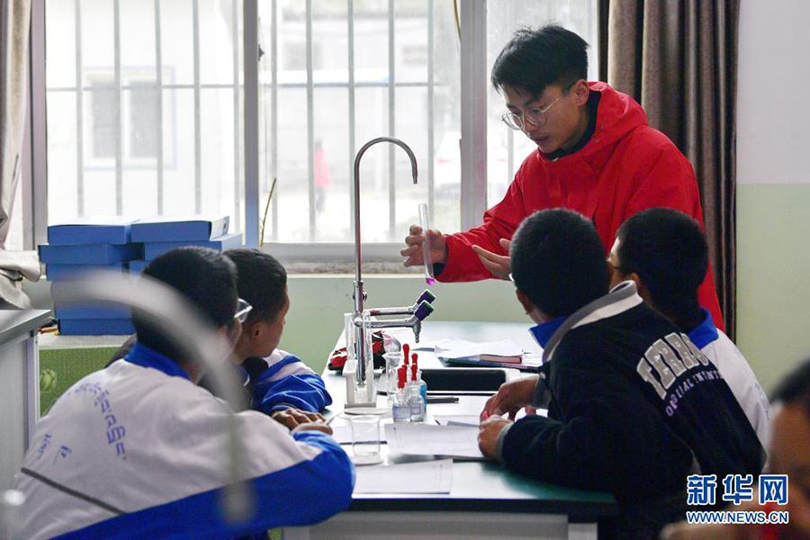 在山南市东辉中学实验室,来自湖北大学化学化工学院的硕士研究生刘思江指导学生做化学实验(3月29日摄)。(新华社记者 张汝锋/摄)